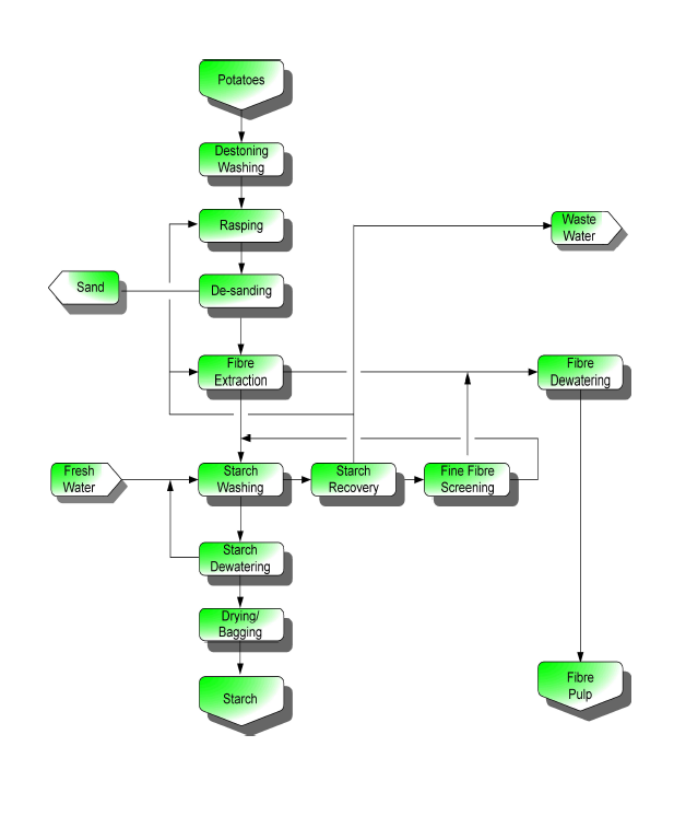 Le lavage, le triage, le broyage, la séparation des fibres, l'extraction de l'amidon et sa déshydratation